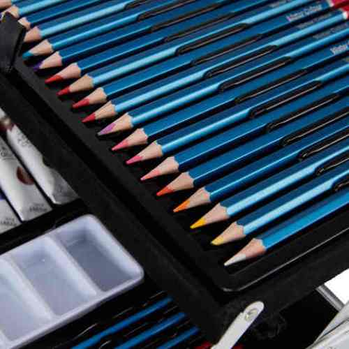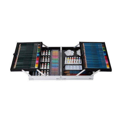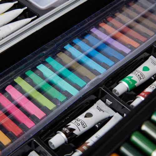 - Includes 28 x water-soluble colour pencils, 28 x coloured pencils, 24 x soft pastels, 12 x 6ml water-colour paints, 12 x 6ml oil paints, 10 x 12ml acrylic paints, 6 x paintbrushes, 3 x plastic palette, 1 x colour mixing guide, 1 x plastic pencil sharpener and 1 x eraser