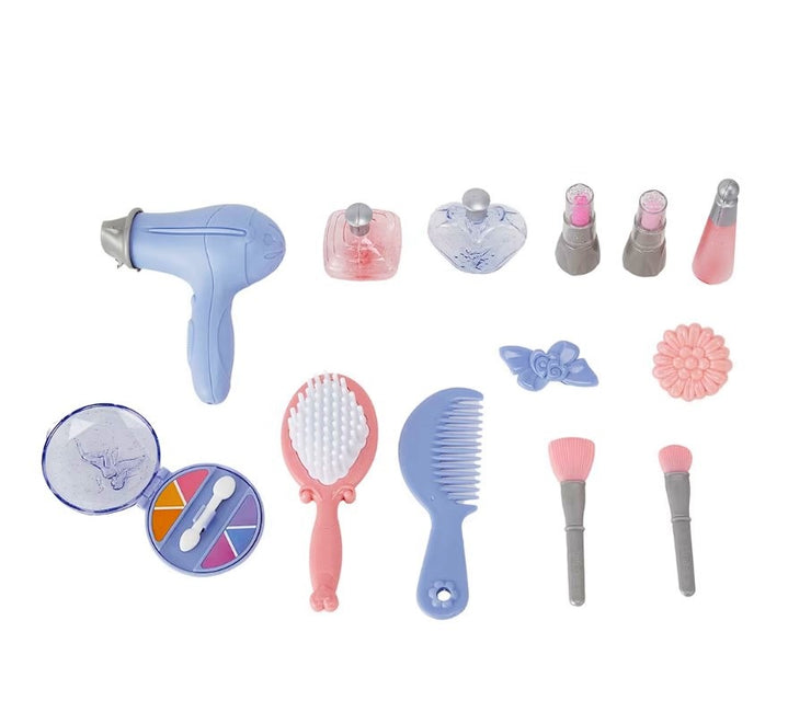 - Includes 1 x table top, 1 x hair dryer, 2 x lip sticks, 2 x perfume bottles, 2 x face brushes, 2 x hair clips, 1 x hair brush, 1 x comb, 1 x nail polish and 1 x eye shadow tray