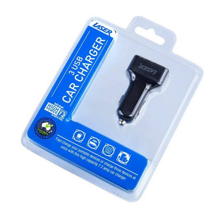 Fast charge 3 devices at once with this high capacity car charger. Each socket delivers up to 12 watts and is compatible with any USB powered device such as smartphones, tablet computers, GPS, cameras and MP3/4 players. The high current rating is particularly useful for new generation smartphones and tablets meaning they will charge faster. The charger is ideal for any truck with a DC power socket (Otherwise known as a cigarette socket- 12v car or 24v truck). It also has over current input and output protection to avoid power spikes from your car. Featuring heavy duty aluminium construction to ensure long lasting performance and reliability, especially in high temperatures. Compact, small and lightweight, every vehicle should have one.