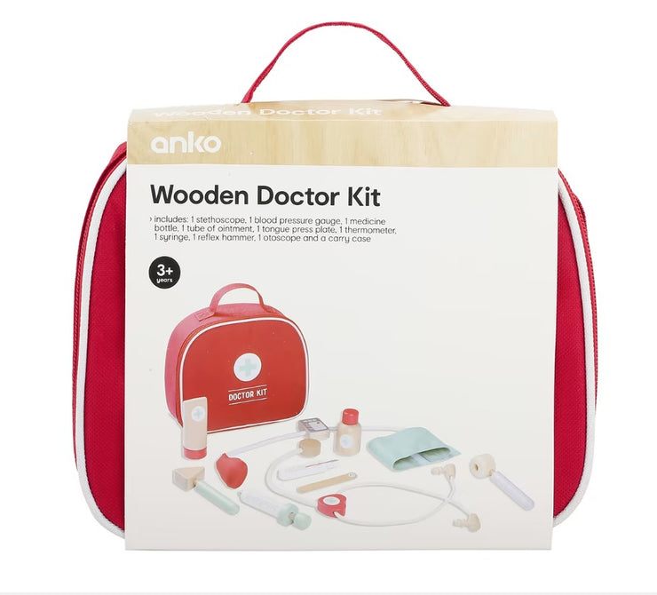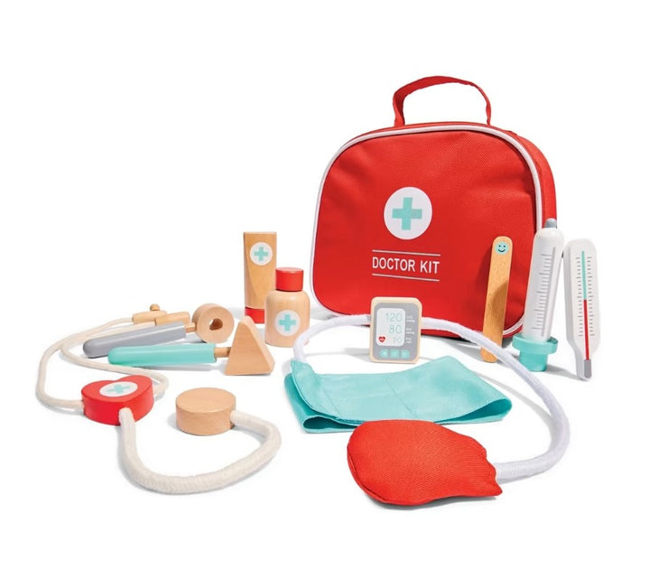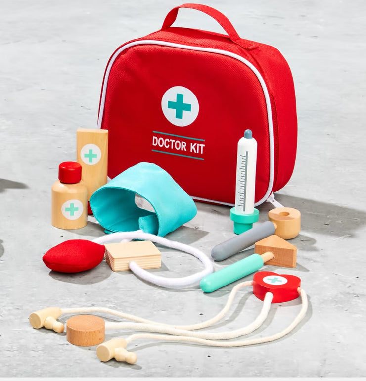 Little ones will love treating sick teddy bears and dolls with this wooden doctor kit!