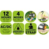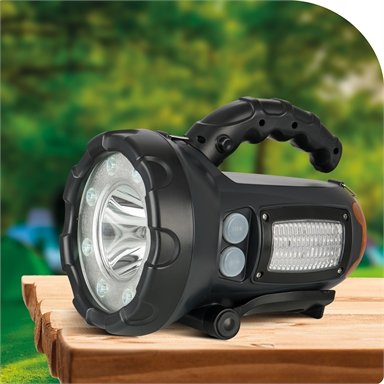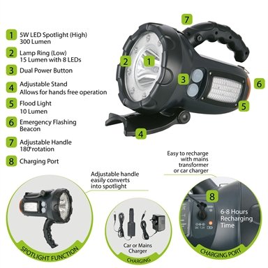 The Arlec Rechargeable Spotlight Torch features a powerful 5W 300 lumen LED long range beam and 8 LED short range light with 15 lumen light output. The side of the torch includes a 10 lumen flood light and a flashing emergency beacon on the back of the torch. This torch also features an adjustable handle and ratchet stand making it the ideal light for general work, home and camping use. Charging accessories and shoulder strap included.
