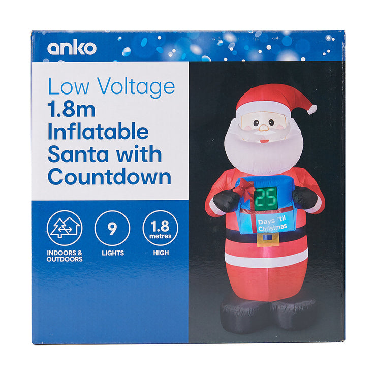 Start the exciting countdown to Christmas by setting up this Festive Decorative Lights Inflatable Santa with Countdown.  Standing at 1.8 metre this inflatable Santa is great to decorate indoor or outdoor this festive season.
