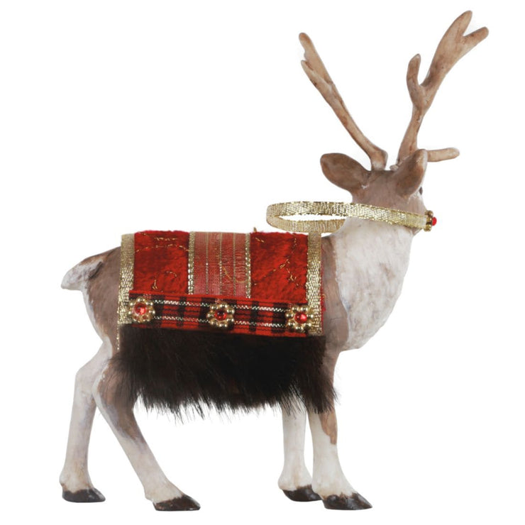 Welcome the wonder of the season with this handsome Christmas tree ornament. The regal reindeer carries an ornate red-and-gold fabric saddle blanket that's trimmed with black faux fur and adorned with ribbon and gem accents.
