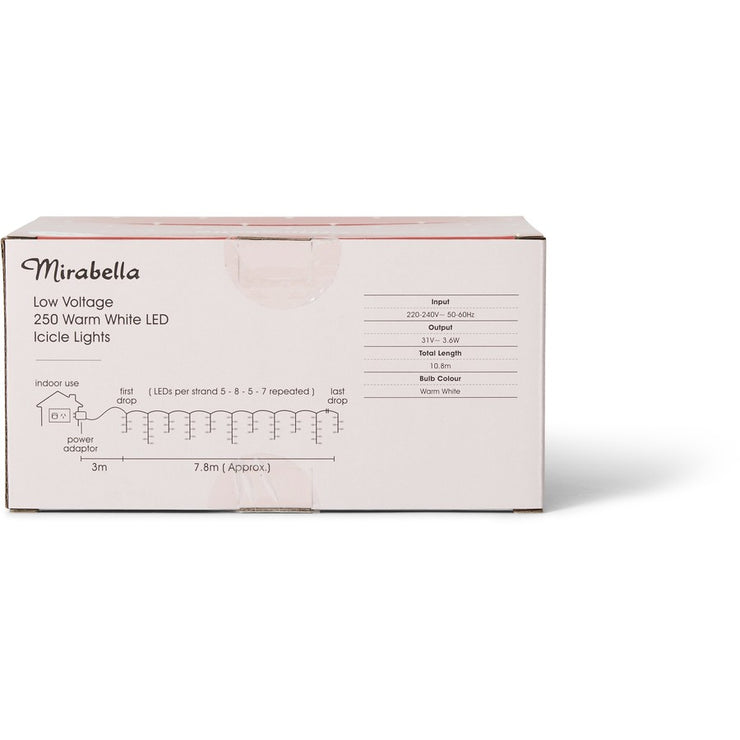 The Mirabella Christmas Low Voltage 250 Icicle Lights - Warm White decorate your home this festive season with the Mirabella Christmas Low Voltage 250 Icicle Lights. Whether you use this set indoors or out, it will shine bright and is sure to set the ambience of your decorated space.