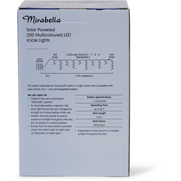 With Mirabella Christmas Solar Powered 200 LED Icicle Lights - Multi-Colour light up your home this festive season. This outdoor set features a solar powered design with steady or flashing functions to spread joy through your neighbourhood.