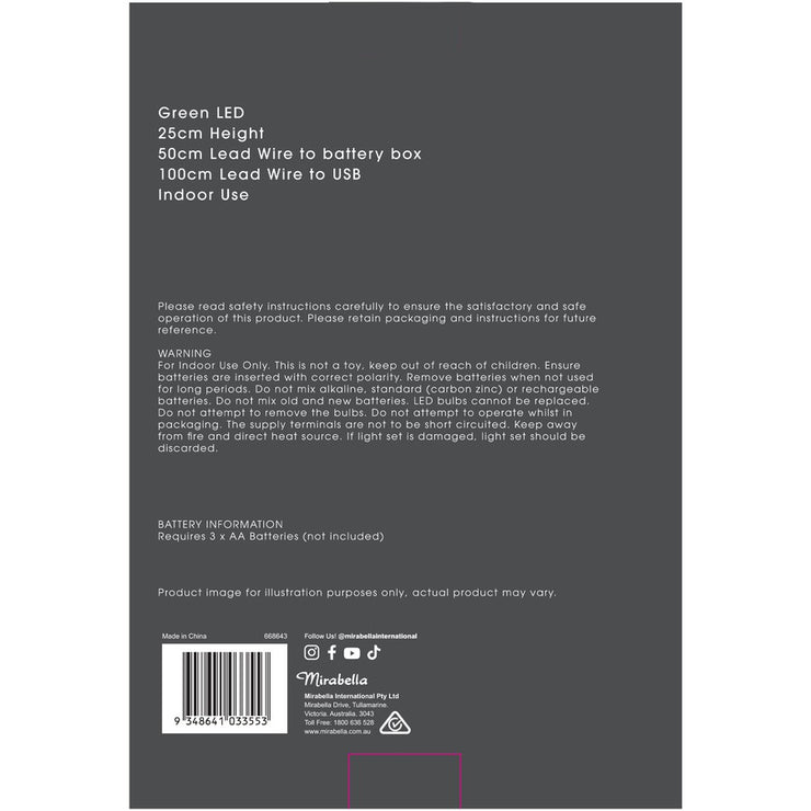Please read safety instructions carefully to ensure the satisfactory and safe operation of this product. Please retain packaging and instructions for future reference. For Indoor Use Only. This is not a toy, keep out of reach of children. Ensure batteries are inserted with correct polarity. Remove batteries when not used for long periods. Do not mix alkaline, standard (carbon zinc) or rechargeable batteries. Do not mix old and new batteries. LED bulbs cannot be replaced. Do not attempt to remove the bulbs. Do not attempt to operate whilst in packaging. The supply terminals are not to be short circuited. Keep away from fire and direct heat source. If light set is damaged, light set should be discarded.