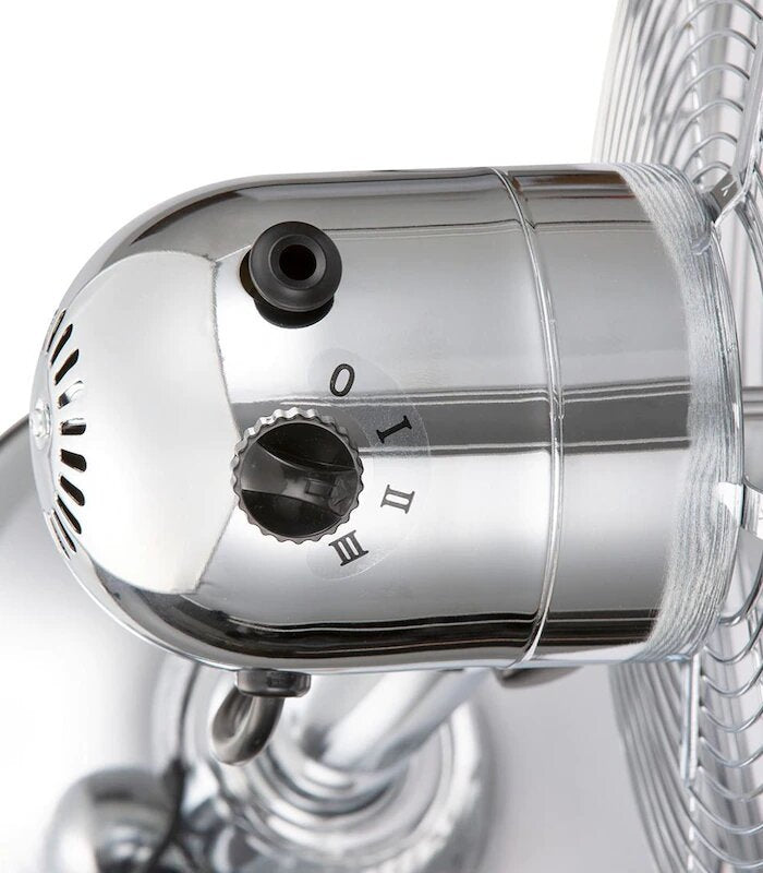 Add a splash of style to your home or office setup with the contemporary polished chrome finish Celsius 30cm Chrome Desk Fan. Choose between 3 speed settings to find your perfect breeze, and switch on oscillation for greater reach. Adjust the tilt to your preference and use the integrated carry handle to move from room to room.