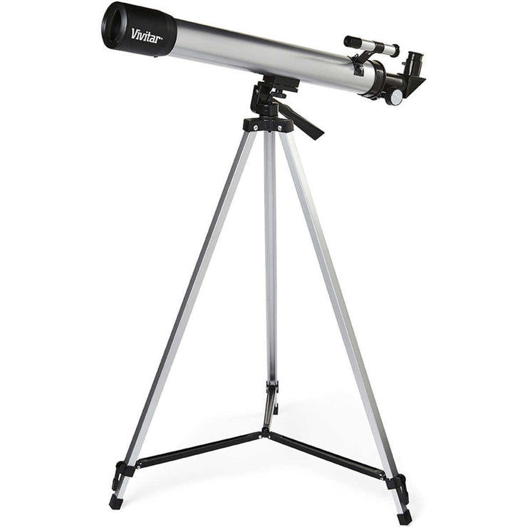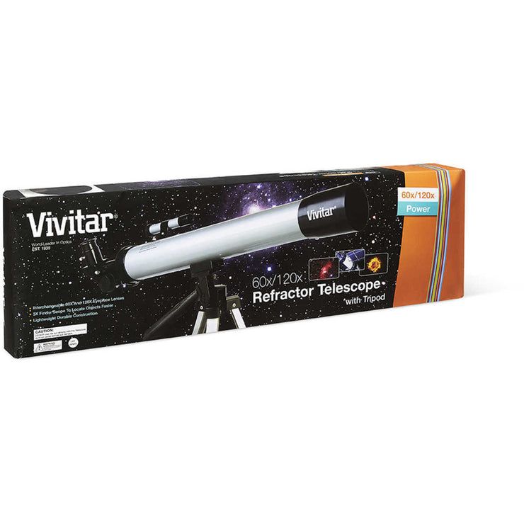 The Vivitar Refractor Telescope 60x/120x with accessories is a powerful telescope you can use at home for stargazing or study of the night sky. This telescope with tripod comes with 60x and 120x eyepiece lenses, as well as 3x finder for locating objects quickly and easily, and a mirrored diagonal eyepiece for the ultimate astrological viewing.