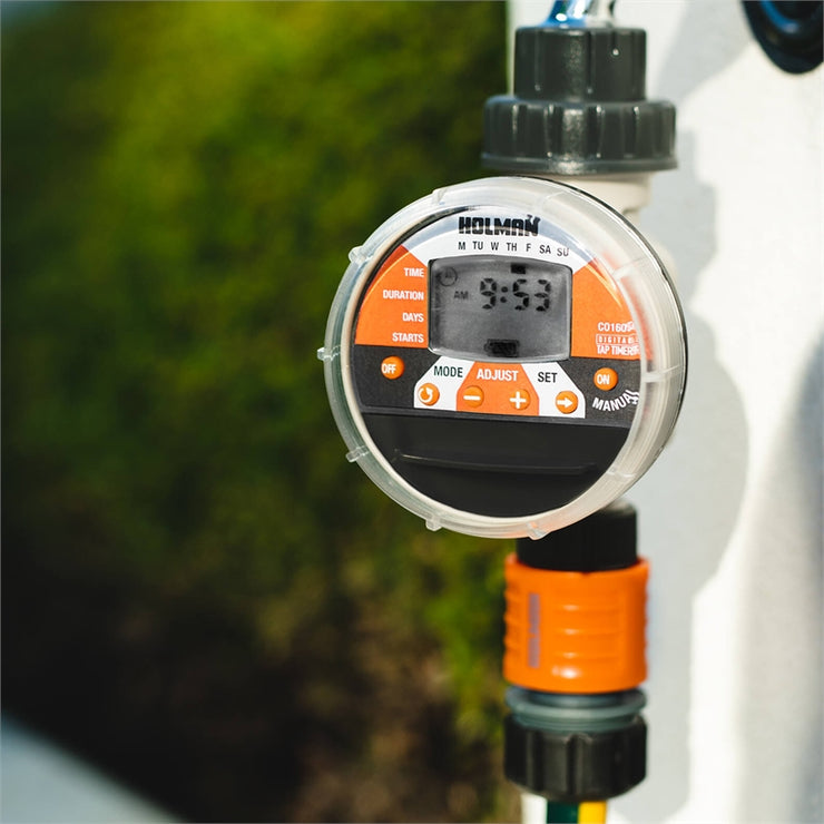 The Holman Automatic Digital Tap Timer is an ideal choice when your garden can only be watered at certain times and on set days, due to watering restrictions. Easily program the tap timer on the LCD display which offers intuitive prompting through the programming steps. It is battery operated (9V) and features low energy use with patented battery life monitoring and display.