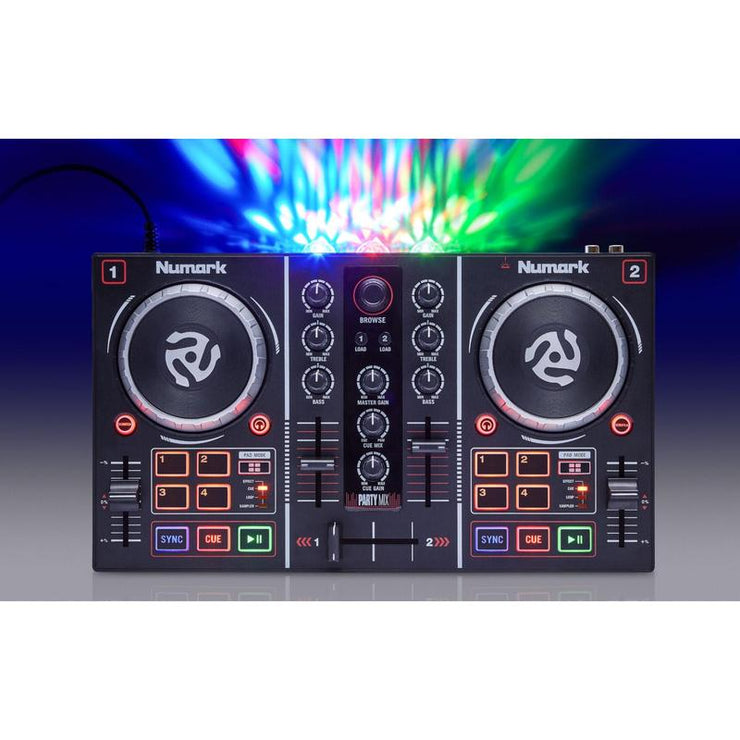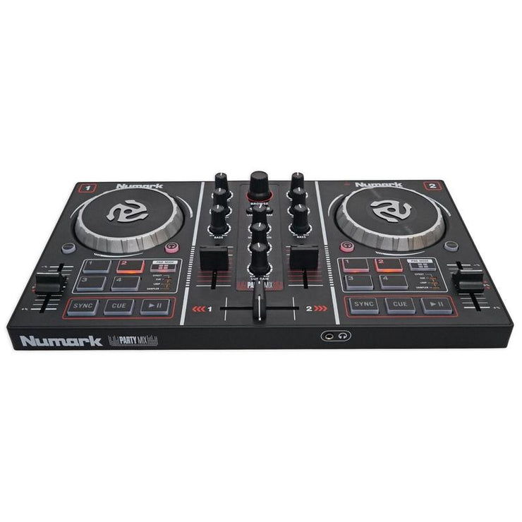 Get the party started with the Numark Party Mix! Connects directly to your laptop and lets you play and mix all of your favorite tunes. Mix, blend and create just the right mood with this 2-channel DJ controller. Preview your mix in your headphones before you crossfade the music to your speakers—just like a pro. With Party Mix, you can easily sync the beat and blend your songs with your playlist.