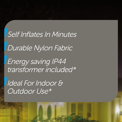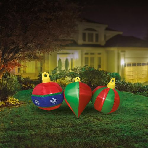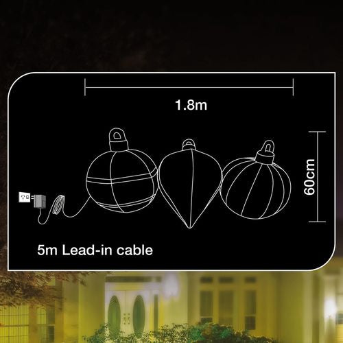 Celebrate the festive season with this 1.8m inflatable low voltage colourful Christmas baubles. Features three bright, low-voltage LED lights and durable nylon fabric.
