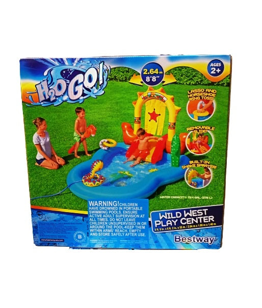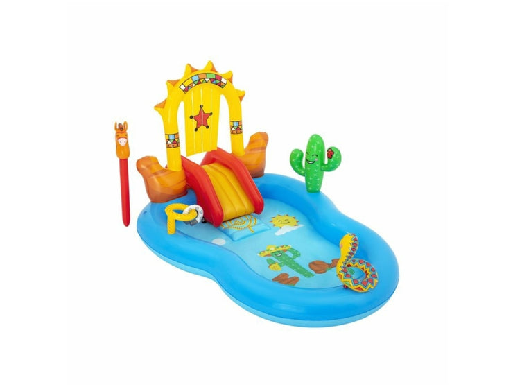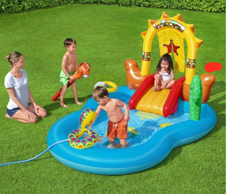 Just like the wild wild west, the Bestway® Wild West Play Pool lets your kids enjoy the thrill of being a real cowboy out on the frontier. First up, they will certainly love the horseplay while riding on the included inflatable horse toy. Also featured with the play pool is a removable slide with a sun archway for more wet and wild west antics. All the while enabling your kids to improve their hand-eye coordination and dexterity. Kids can also play with the snake, which includes a built-in sprinkler to provide extra splashing entertainment. Simply attach a garden hose and let the fun begins.