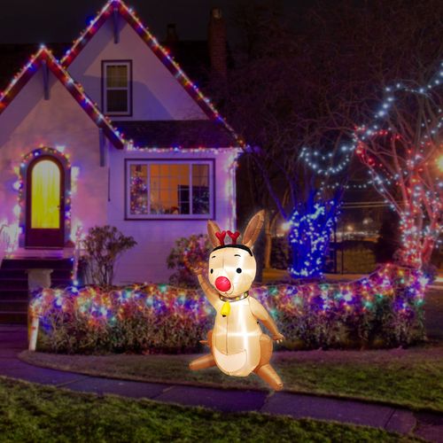 At 1.8m tall, this Kangaroo inflatable is wearing a reindeer costume of red Nose and waving bells.The whole structure inflates in 2-3 minutes and it also comes with its own built-in fan so you don't have to worry about constantly pumping air to keep its shape. Super-bright cool-white LED lights make the structure stand-out during the night. A 5m black lead cable plus pegs and ropes for tie-down are included. It deflats quickly and folds up easily which doesn't take up much storage space so you can keep it safe all-year round until you need some Christmas cheer.This inflatable is suitable for indoor and outdoor use.