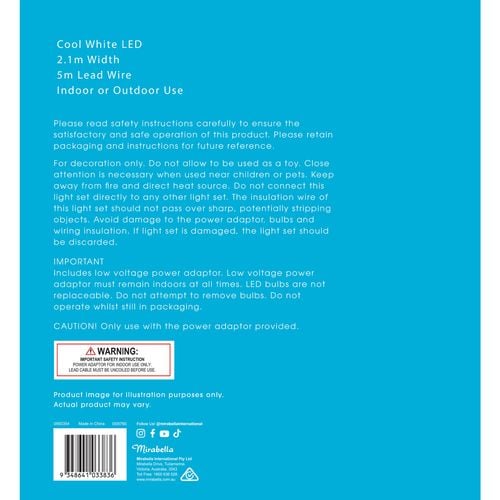 Please read safety instructions carefully to ensure the satisfactory and safe operation of this product. Please retain packaging and instructions for future reference. For decoration only. Do not allow to be used as a toy. Close attention is necessary when used near children or pets. Keep away from fire and direct heat source. Do not connect this light set directly to any other light set. The insulation wire of this light set should not pass over sharp, potentially stripping objects. Avoid damage to the power adaptor, bulbs and wiring insulation. If light set is damaged, the light set should be discarded. CAUTION! Only use with the power adaptor provided.