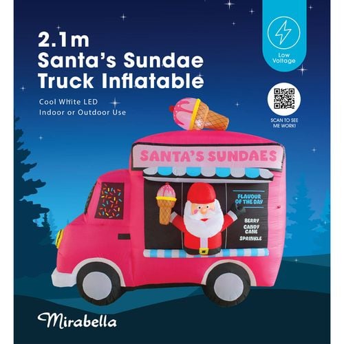 This festive season, transform your home into a joyful spectacle, with the Mirabella 2.1m Santa's Sundae Truck Inflatable. This delightful decoration promises to captivate guests of all ages, with its warm glow and merry charm. Perfect for indoor and outdoor use, setting up is a breeze - watch as it self-inflates within minutes! Embrace the spirit of Christmas, with this fun and entertaining addition to your home!