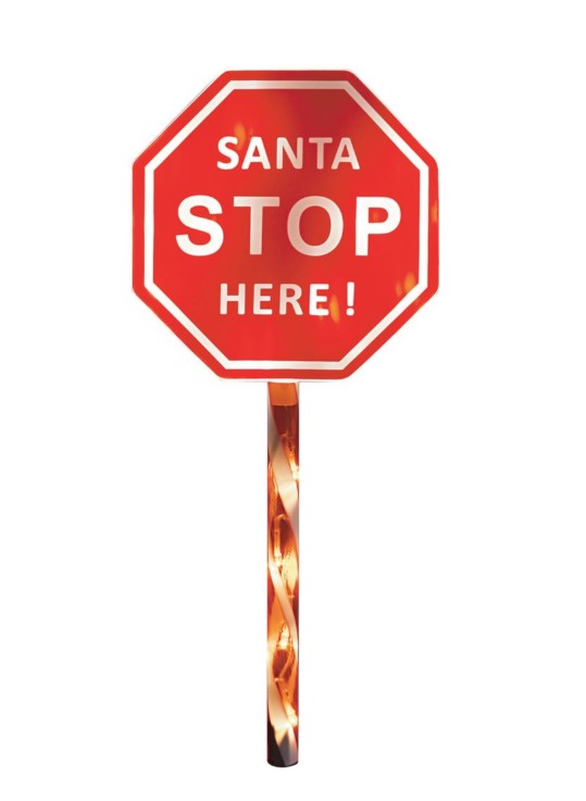 - 45cm Santa Stop Here Sign: Solar Powered, warm white LED, 2m lead wire from power adaptor to decoration, plastic garden spike included