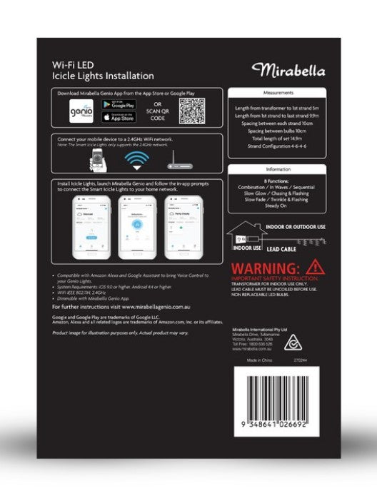 Decorate your home this festive season with with the Mirabella Christmas Genio Wi-Fi 500 LED Cool White Icicle Lights. These multifunction lights are controllable with the Mirabella Genio App on your Smart Phone. Choose from various light functions and ideal to light up Christmas trees or areas in your home. Mirabella Genio App available from the App Store or Google Play. Works with Google Home & Amazon Alexa. Add a little extra magic to your festive set up.