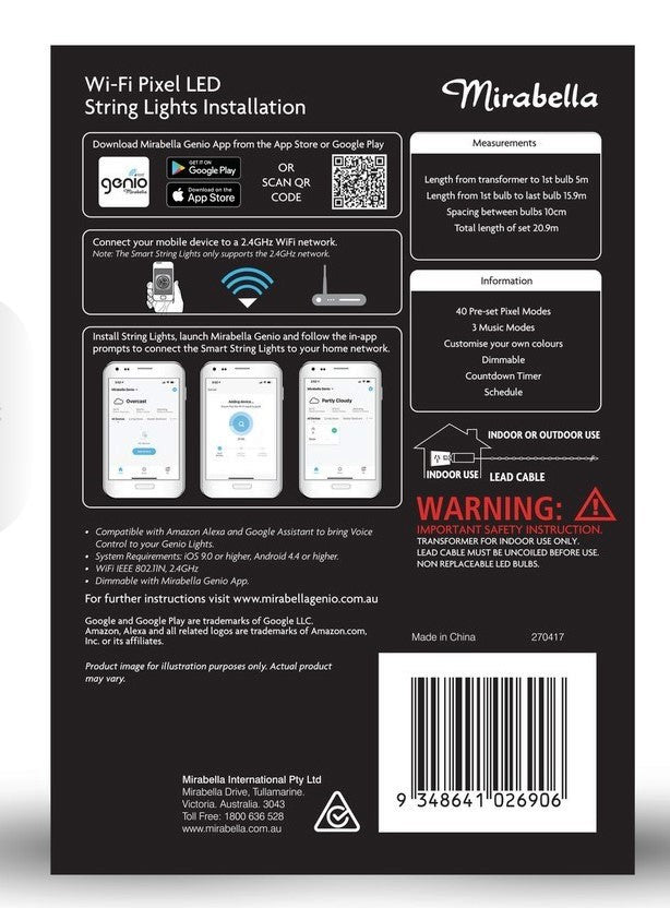 Decorate your home this festive season with with the Mirabella Genio Christmas Wi-Fi 160 Pixel LED String Lights. These colour changing lights are controllable with the Mirabella Genio App on your Smart Phone. Choose from various pre-set light functions or simply customise your own colours. It is ideal to light up Christmas trees or areas in your home. Mirabella Genio App available from the App Store or Google Play. Works with Google Home & Amazon Alexa. Add a little extra magic to your festive set up.
