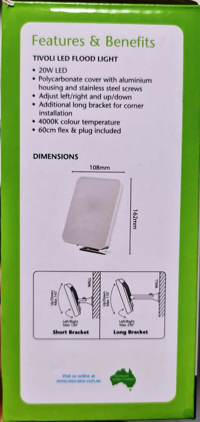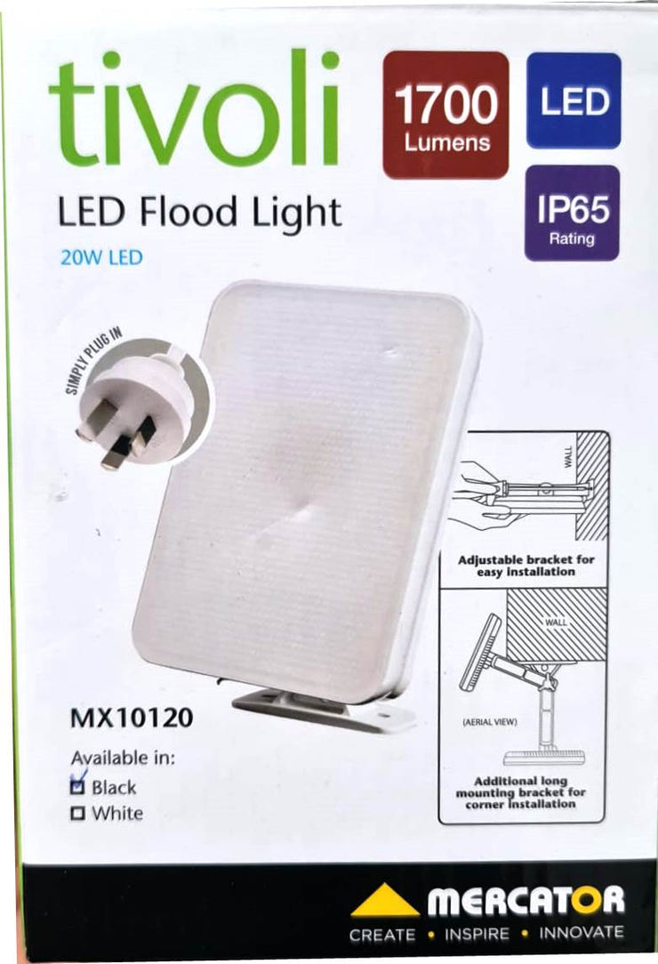 Mercator Tivoli 20W 1700lm LED Flood Light - Black Adjustable mounting arm (Includes additional long arm bracket for corners installation)