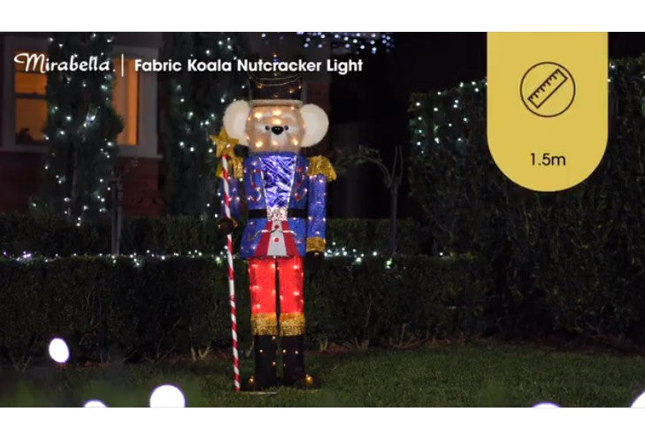 Decorate your home this festive season with a 1.5 meter Koala Nutcracker LED Decoration with 100 steady flashing LEDs. This is a great central feature to any indoor or outdoor display. This product is easy to set-up, comes with ground pegs to help set-up securely, and is made with weather resistant fabric.