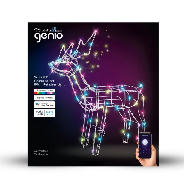 Decorate your home this festive season with the Mirabella Genio Wi-Fi LED Colour Select 80cm Reindeer Light. Control these lights with the Mirabella Genio App on your Smart Phone. Mirabella Genio App available from the App Store or Google Play. Works with Google Home & Amazon Alexa. You can schedule these lights to turn on or off and adjust the appearance as desired. Select from 7 different colours and 8 special light functions.