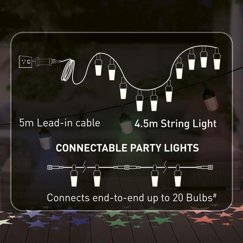 These Arlec 10 Connectable LED Multi-Star Projector Party Lights Low Voltage are great for any kind of occasion. Each light features a bright, long-life LED globe which projects a star-shaped pattern. This string light set can be used indoors or outdoors, and up to 20 bulbs can be connected.