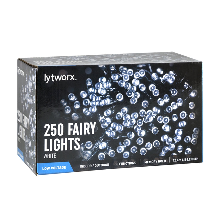 The Lytworx 250 White/ Warm White LED Fairy Party Lights are ideal for decorating the inside or outside of your home for functions and parties. Featuring 250 warm white LEDs and a built-in function controller, which allows you to choose between 8 steady and flashing effects. For added convenience, this item includes a 'memory hold' feature which remembers your last flash setting even when the power is turned off.