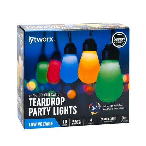 These Lytworx 3-in-1 Colour Switch Party lights come with 10 tear shaped bulbs that bring a fun and relaxed atmosphere to any space indoors or outdoors. Whether you’re searching for away to brighten up your home, garden, wedding, party, or venue these Lytworx party lights are just what you need.