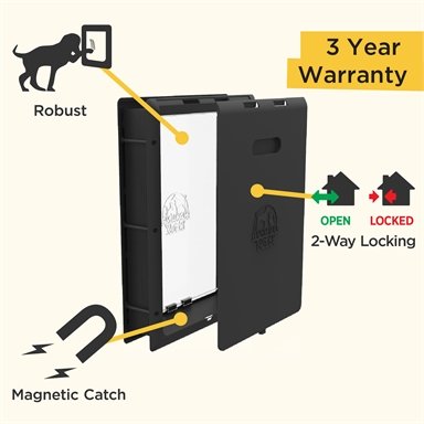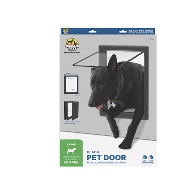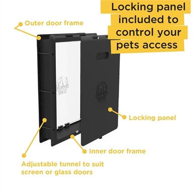 The large black pet door includes a slide-in locking panel to stop drafts and prevent insects from entering your home. Quick and easy to install with simple step-by-step instructions, cutting templates and all necessary hardware.