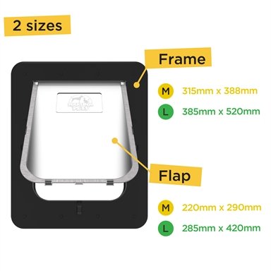 - The large-sized door has a 385mm x 518mm frame, 332mm x 470mm cut-out, 285mm x 420mm flap