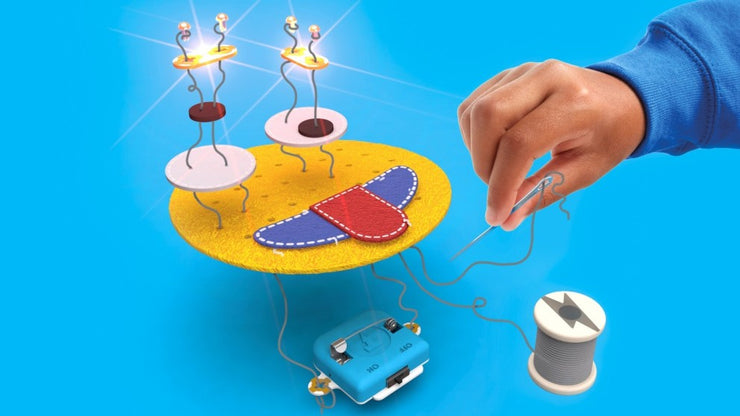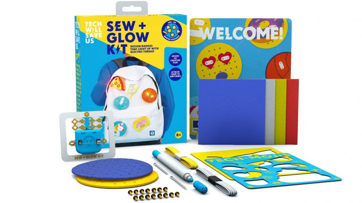 • With an electro conductive thread and a battery pack, the Tech Will Save Us Sew & Glow Kit lets children sew through the included colourful felt fabric and create electric circuits to watch the badges light up.