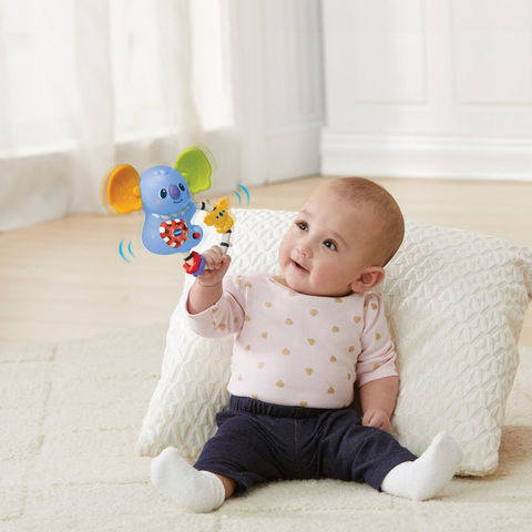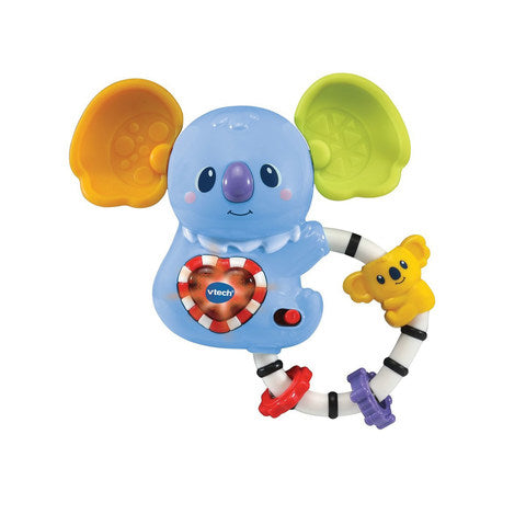 When the Twist 'N' Play Koala comes out to play, he's sure to entertain your little one! Twinkling heart button triggers phrases about feelings, fun facts about the koala, silly sounds and entertaining music and songs. When your little one gives the adorable koala toy a shake, it will respond with playful sounds and short tunes. Twisting the koala's colourful textured ears develop fine motor skills. Its textured handle is perfectly sized for little ones to hold, while the sliding rings and koala bead promote tactile stimulation. Kids can shake and play on the go with the cute koala baby rattle!