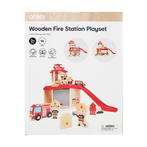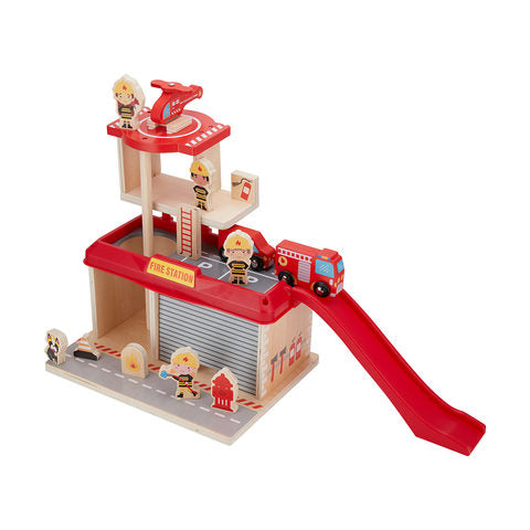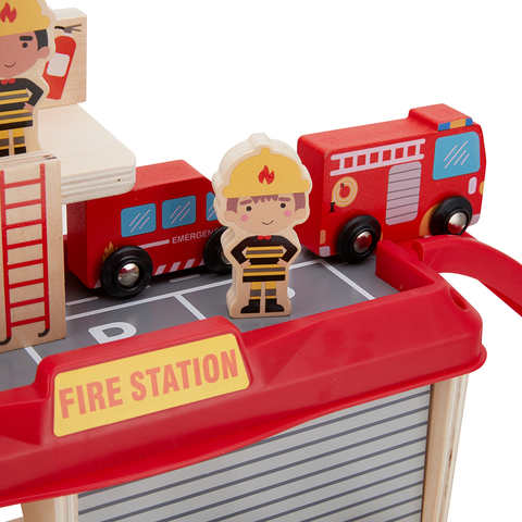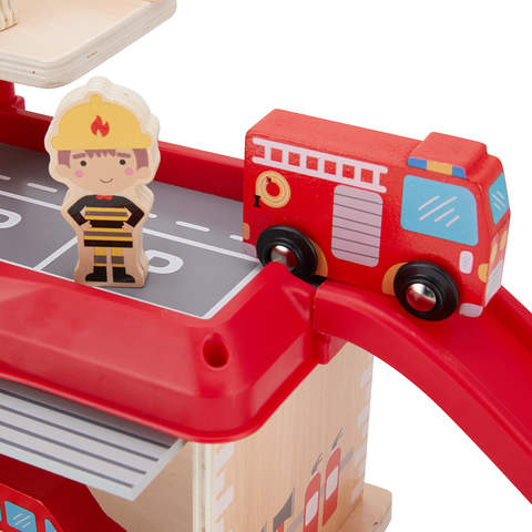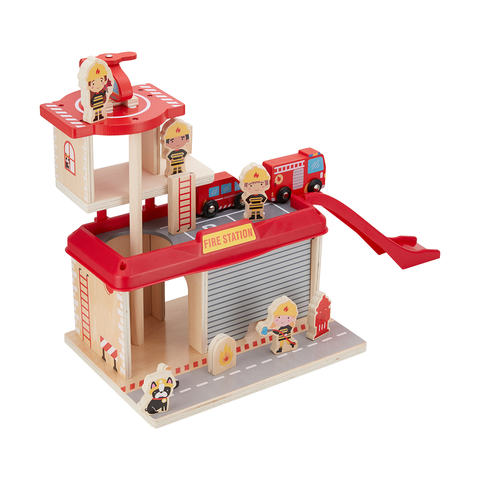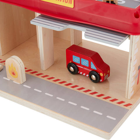 Little rescuers will enjoy roleplaying with this wooden fire station playset.