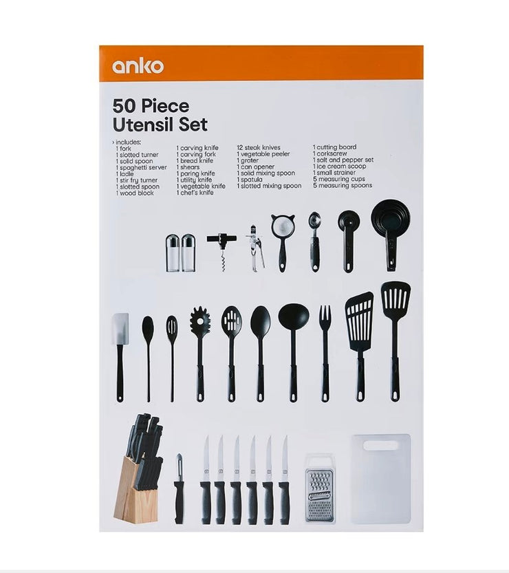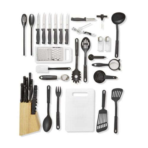 - Includes 1 x fork, 1 x slotted turner, 1 x solid spoon, 1 x spaghetti server, 1 x ladle, 1 x stir fry turner, 1 x slotted spoon, 1 x wood block, 1 x carving knife, 1 x carving fork, 1 x bread knife, 1 x shears, 1 x pairing knife, 1 x utility knife, 1 x vegetable knife, 1 x chef's knife, 12 x steak knives, 1 x vegetable peeler, 1 x grater, 1 x can opener, 1 x solid mixing spoon, 1 x spatula, 1 x slotted mixing spoon, 1 x cutting board, 1 x corkscrew, 1 x salt and pepper set, 1 x ice cream scoop, 1 x small strainer, 5 x measuring cups and 5 x measuring spoons
