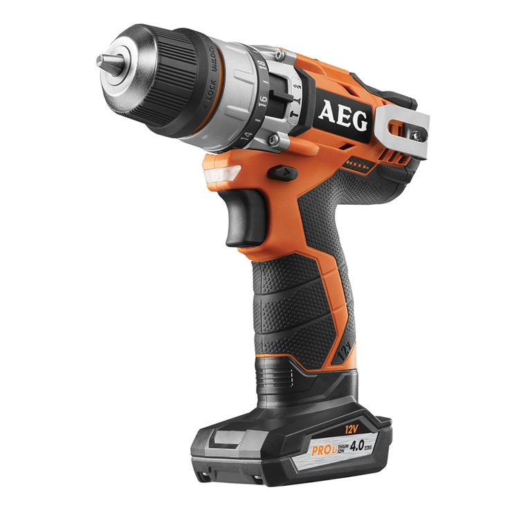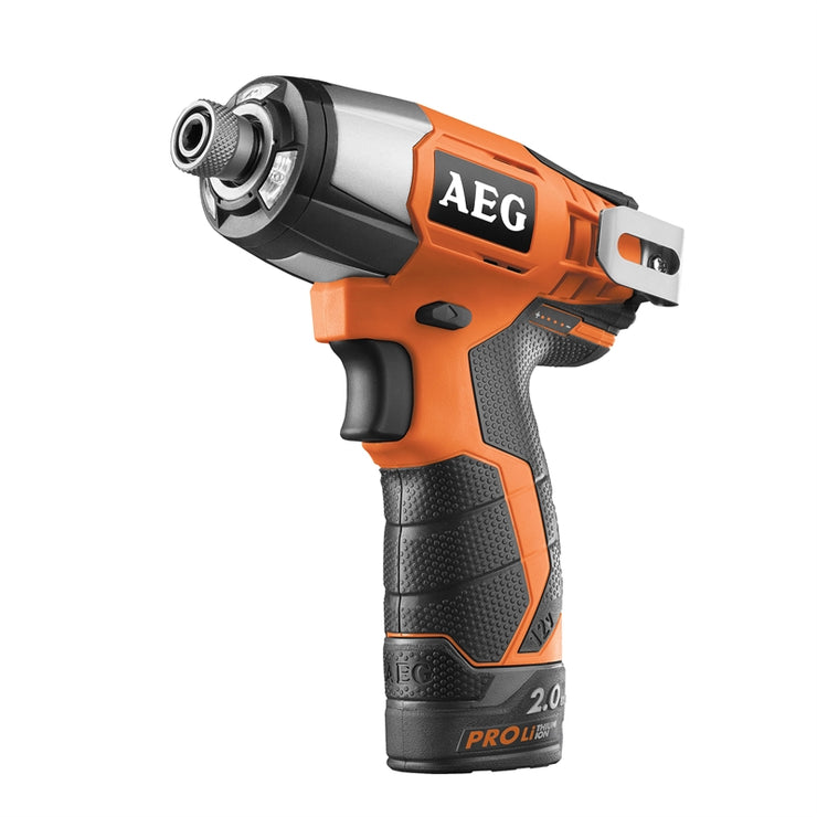 The AEG 12V brushed 2pc combo kit comes with the AEG 12V hammer drill and the single-speed impact driver. It also includes 2 battery packs and a charger.
