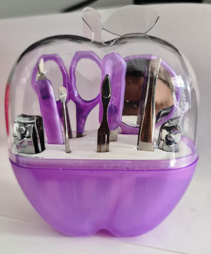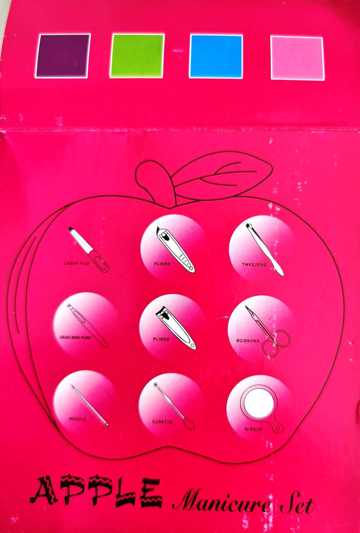 Apple Manicure Set This 9 piece grooming set is perfect for youngsters and adults alike as it is a high quality nail set put together in an organised pack which keeps it simple, compact, and yet it's easy to transport.
