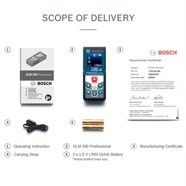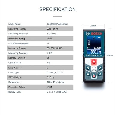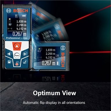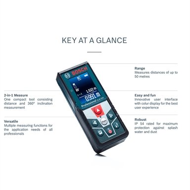 The Bosch GLM 500 Distance Measurer laser can measure up to 50m. The GLM 500 has an integrated 360° incline sensor for precise and easy to operate measuring. The GLM 500 has an illuminated colour display, which turns automatically. User friendly interface and keypad. The device has a memory of up to 20 measurements and a digital bubble for levelling.