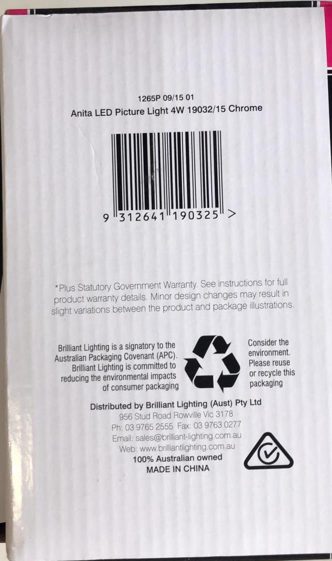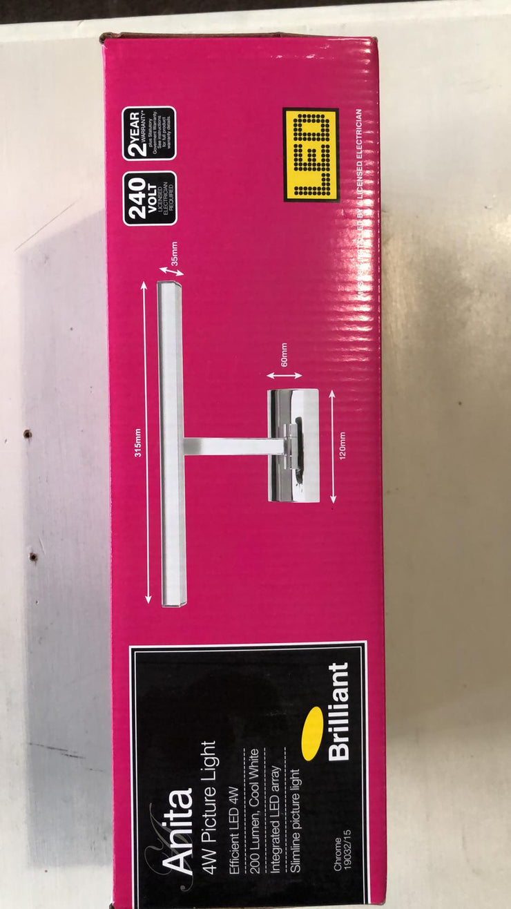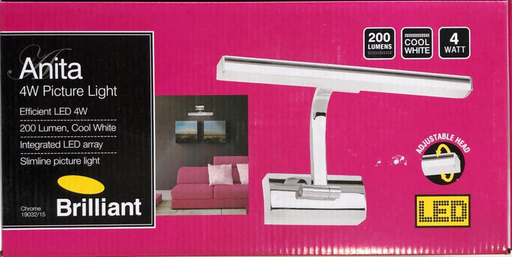 Brilliant LED Anita 4W Picture Light is a stylish design to suit any room and is great for indoor photoshoots. The chrome finish and sleek design bring a touch of elegance to your home.