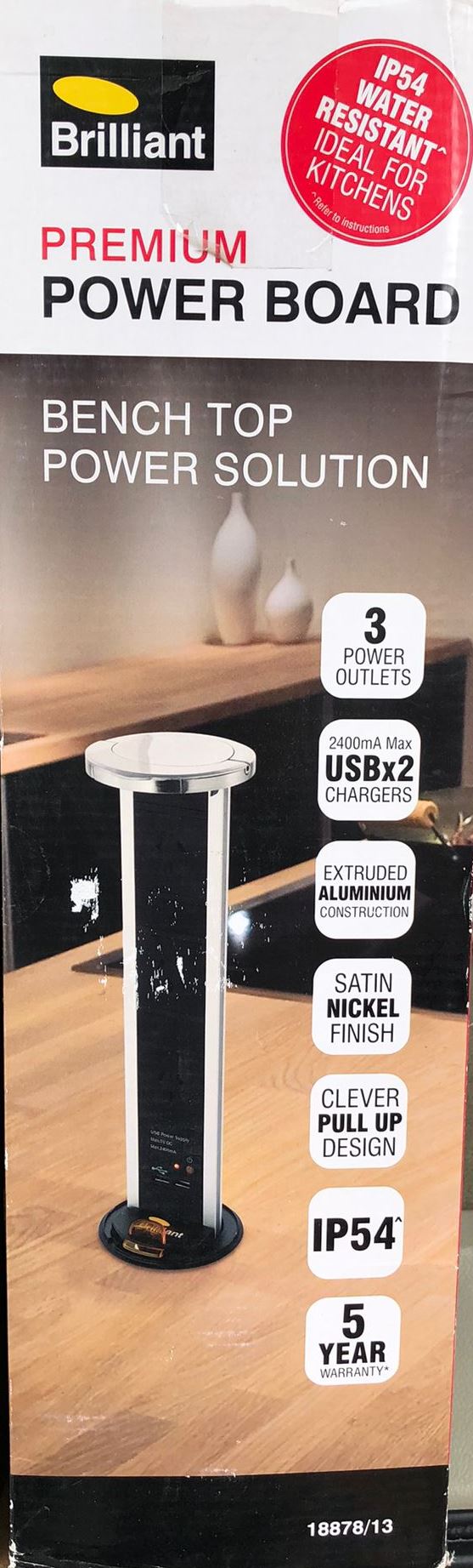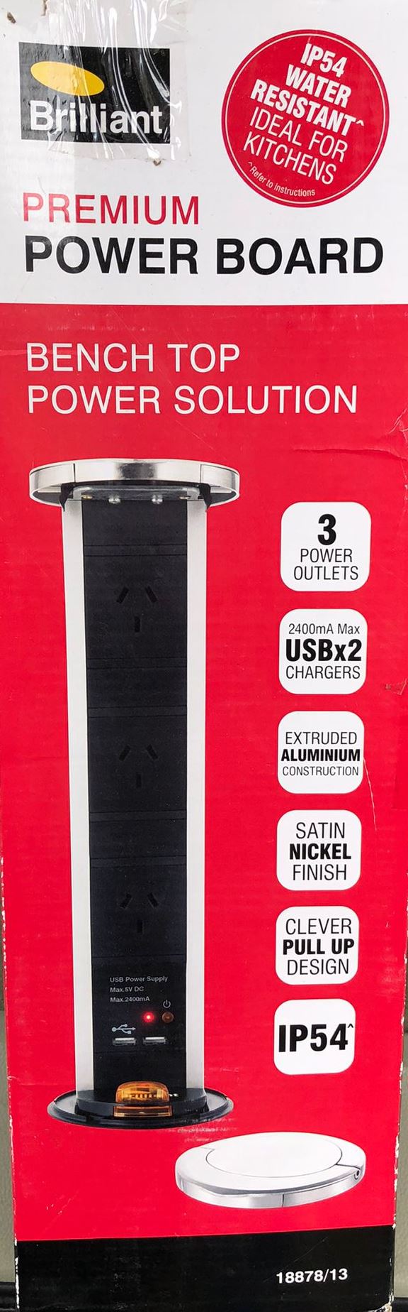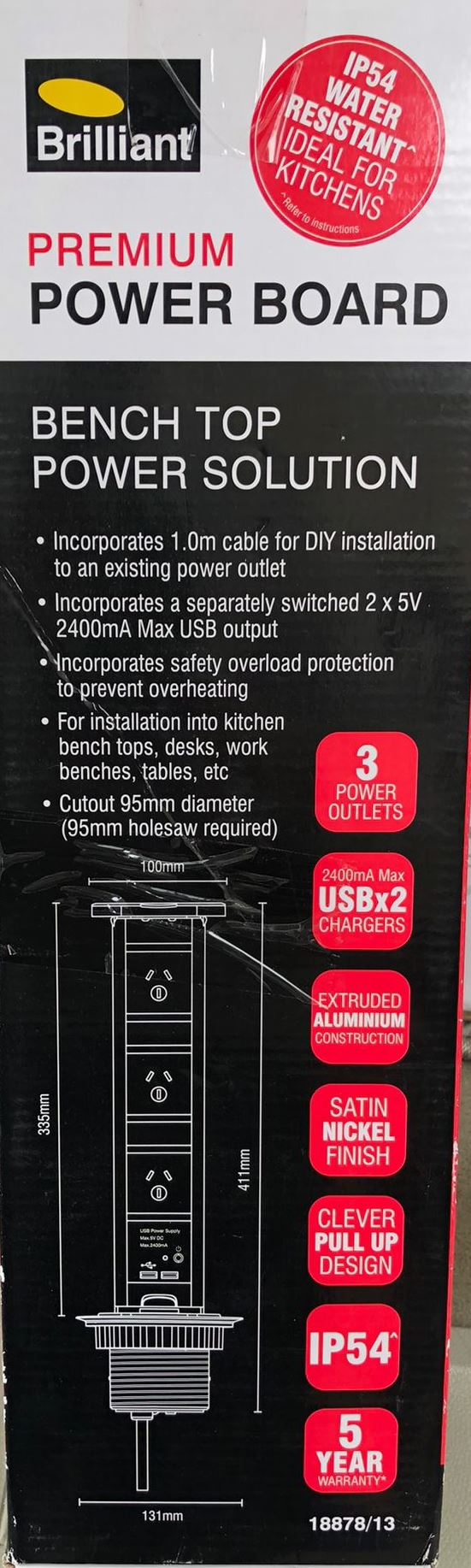 This innovative Power Board from Brilliant is designed for convenience at your workplace. With a stylish look, this easy-to-install pull-up/push-down design is a safe alternative to exposed electrical sockets. Use this powerboard in your kitchen to connect appliances, on your desk to charge your laptop and/or other devices or in the workshop for power tools. This powerboard from Brilliant also has a separately switched 2x USB2 charging ports providing 2.1amps of power at 5V capable of charging smart phones, tablets, mp3 and music players, GoPros, Digital Cameras, and similar other devices that require charging through USB port.