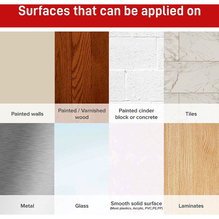 - Works on a variety of indoor surfaces, such as painted Gyprock, finished wood, tile, metal and glass