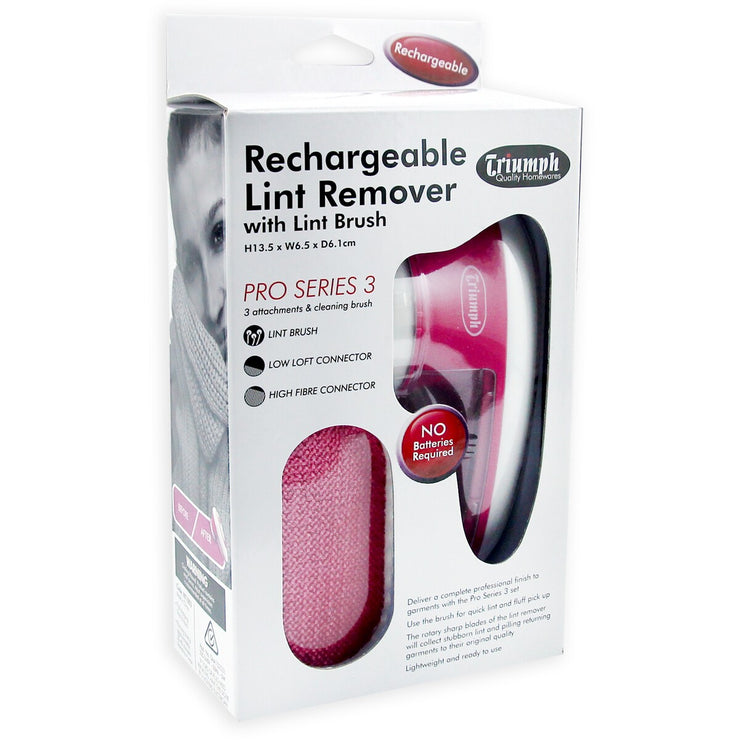 Keep neat and tidy with the Triumph Rechargeable Lint Remover Set. The set features a rechargeable powerful lint shaver with high and low loft attachments. The pack also includes a clip-on lint brush to complete the process of professionally removing lint from your clothes, and returning garments to their original quality.