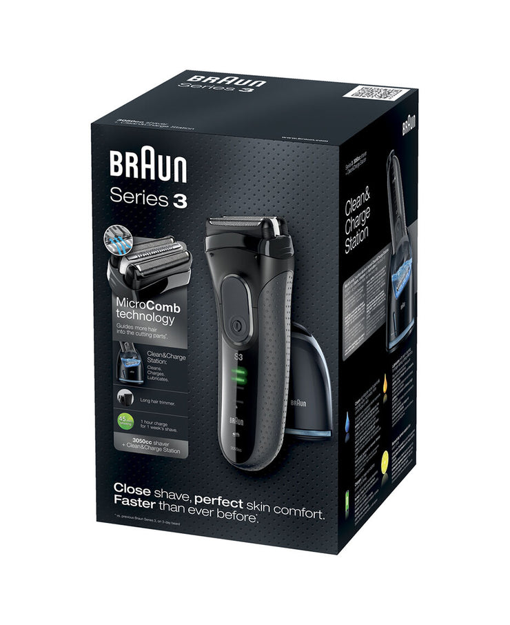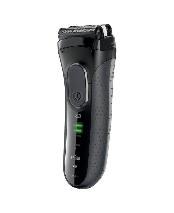 The Braun Series 3 rechargeable electric foil shaver provides faster shaving with great skin comfort. The 3 pressure-sensitive shaving elements adapt to every facial contour and the specialised Micro Grip capture more hairs in the first stroke.