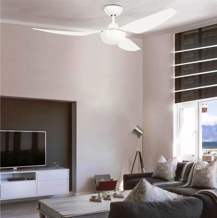 Durable ABS construction, suitable for indoor and covered outdoor areas. Contemporary design with high air circulation blades and reversible cycle for use all year round. Includes 3-speed remote control. Option to upgrade to a smart ceiling fan with an additional purchase of the Brilliant smart remote control. Works with Google Assistant, Alexa and IFTTT.