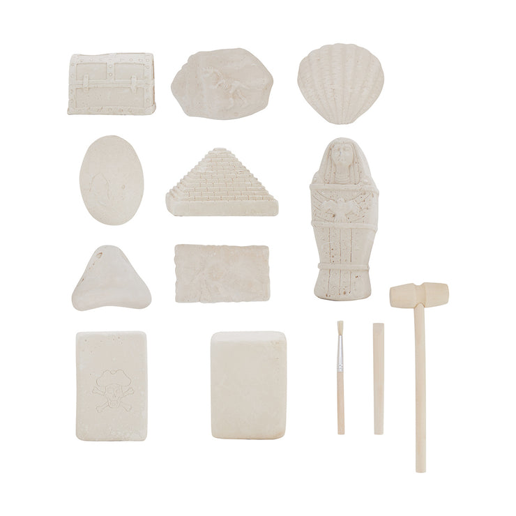 - Includes 10 clay formations, 1 chisel, 1 brush, 1 hammer and instructions