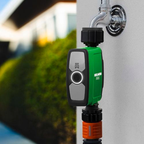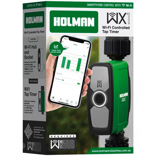 The new WX1 Tap Timer connects via the Wi-Fi Hub, to give you access from anywhere. Manually power the WX1 Tap Timer with the on-board power button or set up automatic schedules using Holman Home.