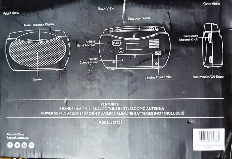 Portable Radio with AM/FM Band - RT222 with 2 bands, Analog Tuner telescopic antenna works on mains and batteries. It has extended playing time and convenient controls so you can tune to news or music quickly and easily. This radio has excellent sound with a large loudspeaker, and easy controls perfect for better personal music enjoyment.