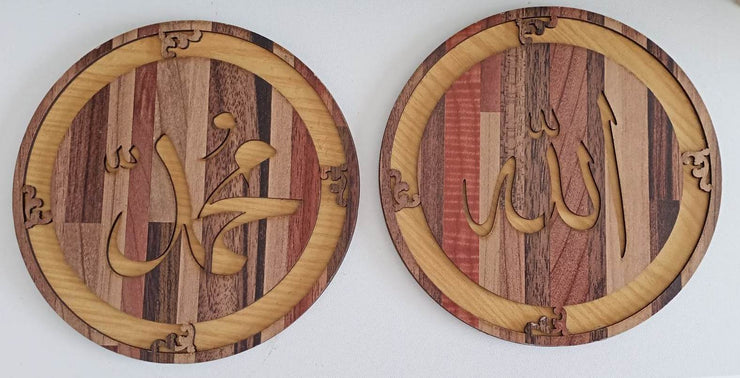 Allah & Muhammad Barkat Name Kalma Circular Wood Art Craft Wall Decoration 2 Piece