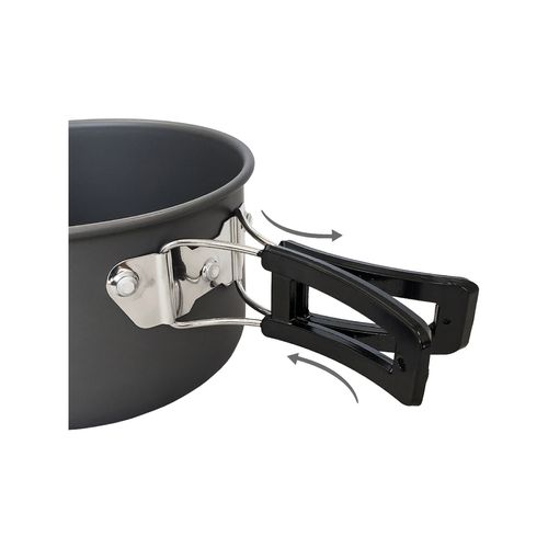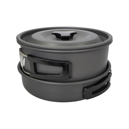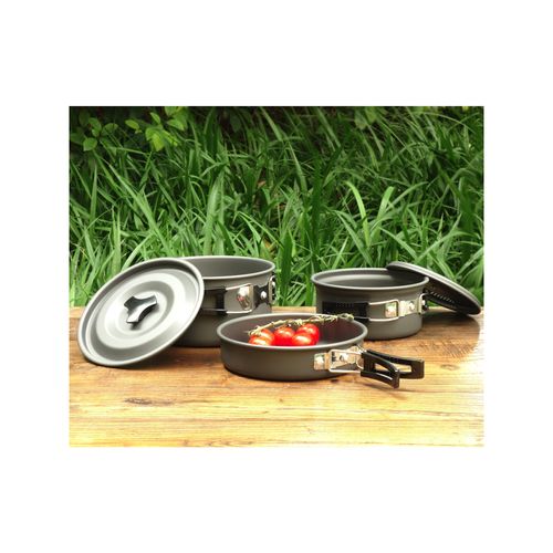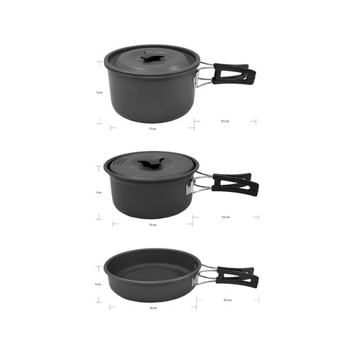Cook up a storm on your next camping adventure with this Jumbuck 3 piece Camping Pot Set. The three piece set consist of two saucepan and one frying pan. Made from rust resistant aluminium construction with folding cool touch handles. Easy to clean and packs away conveniently in a carry bag.