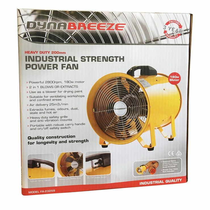 The Dynabreeze 200mm 2 in 1 blow and extract fan is very convenient for your work site or factory. It has a powerful motor and comes equipped with a heavy duty safety grille and anti-vibration mounts.