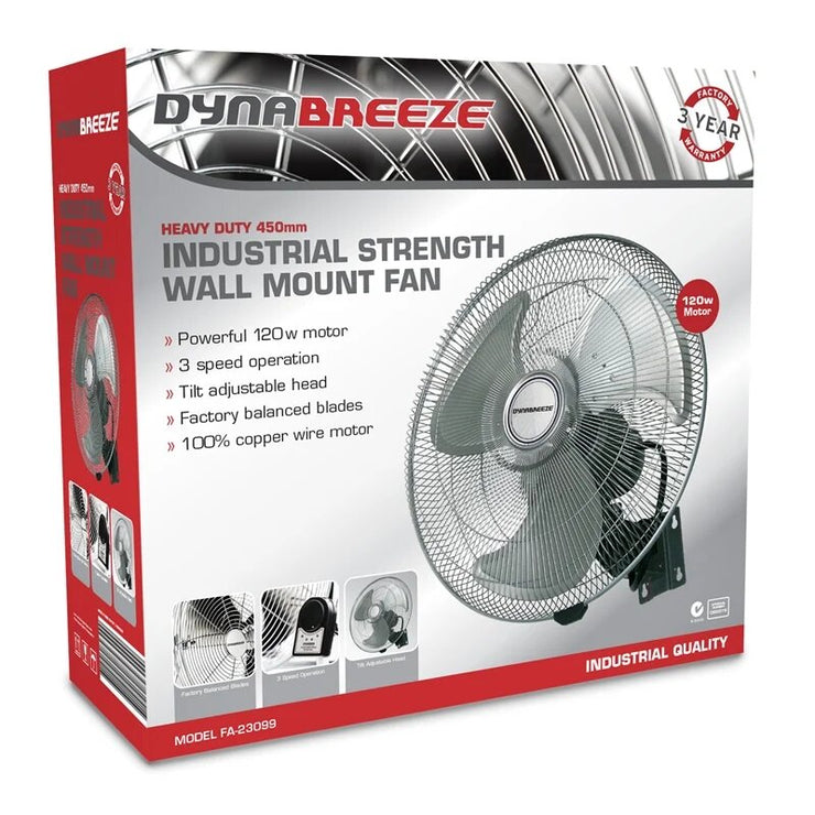 The Dynabreeze 450mm Industrial Wall Fan Control the temperature throughout your home during summer using the Dynabreeze large 450mm blade fan. Easily mounted to the wall for safety and stability, you can ensure your any room stay cool with a 3 speed operation for personal preference.